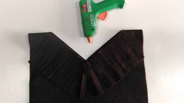 Una vez recortada la pegaremos alrededor de nuestro cuello con la ayuda de la pistola de silicona. Tener en cuenta que al llegar al pico tendremos que hacer un pequeño fruncido (dobladillo) para que nos quede bien la forma.